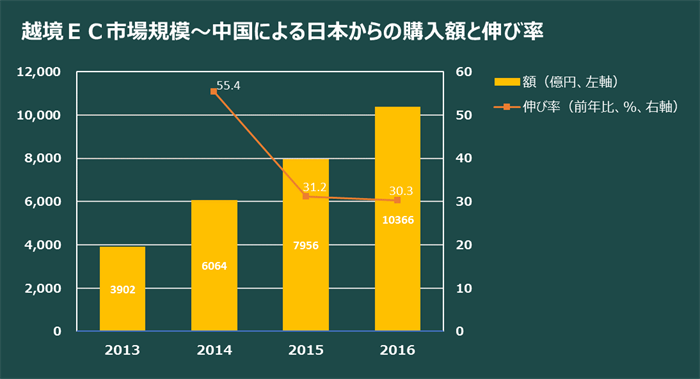 2014年の中国からの越境ECによる日本商品の購入額は、前年比55.4%増加(!)という驚異的な伸びとなっていました。増加率は、翌年の2015年には30%台、2016年も同じく30%台となっています。