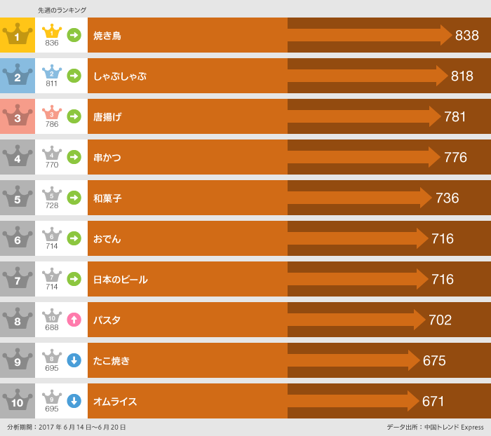 今週の【週次ランキング解説】では、2017年6月14日~6月20日の新浪微博上の書き込み件数をもとに作成した、日本で「食べた」ランキングについて取り上げます。