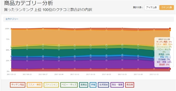 まずは商品カテゴリー分析で全体を確認してみましょう。トレンドViewerの機能である「商品カテゴリー分析」とは、買ったランキング上位100位について、「アイテム数」「クチコミ数」を集計し、その内訳をカテゴリで分析したものです。