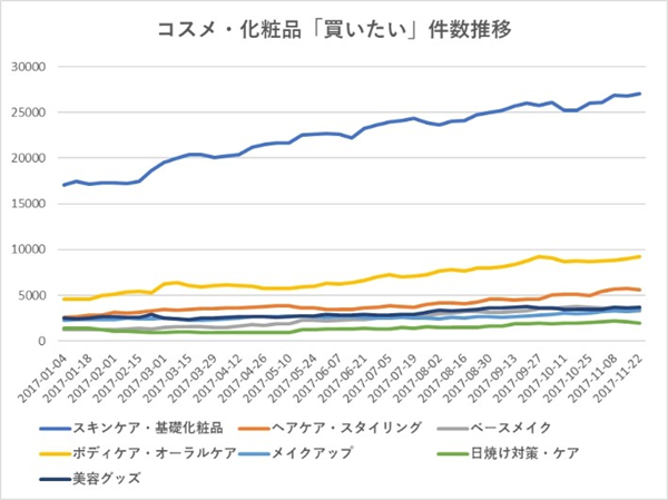 昨年11月22日の週についてクチコミ数を見てみると、化粧品の人気は依然として高く30%を超えて他を突き放しています。化粧品カテゴリを追う衛生・健康カテゴリが健闘しているものの、推移を見てみると化粧品カテゴリ以外のクチコミ数は大きく伸びていないのが現状です。「日本で買った」「買いたい」全クチコミ数の推移を見ても、上記と同様の傾向となっています。
