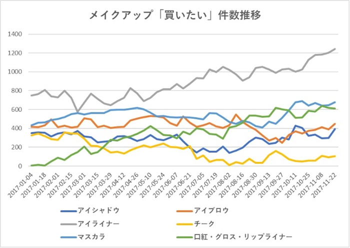 メイクアップカテゴリについて、「日本で買いたい」クチコミ件数推移を見てみましょう。