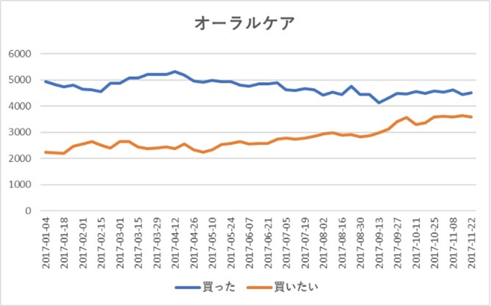 次に、オーラルケアカテゴリについて、「日本で買った」「日本で買いたい」クチコミを比較してみたいと思います。