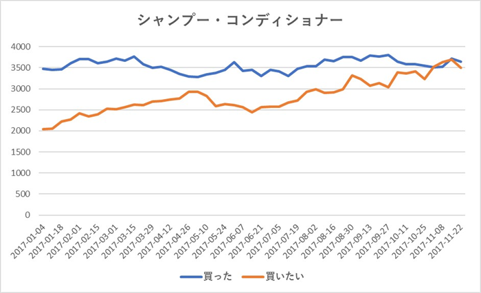 「日本で買った」クチコミ件数推移には緩やかな減少傾向が見られますが、「日本で買いたい」クチコミ件数は上昇傾向にあり、今後も関心が高まっていくと考えられます。