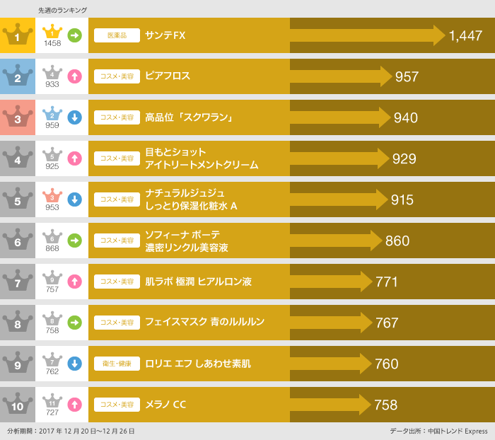 今週の【週次ランキング解説】は、2017年12月20日~12月26日の期間、中国のECサイトから独自集計(※)し作成した「ECサイト人気日本商品」ランキングです。