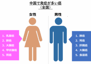 女性に関していえば「乳腺癌」の増加。これは都市部で乳がん検診が普及し、発見率が高まったことによると推定されています。より注目されるのは肺癌。近年、北京や上海などの大都市では女性の喫煙が増加・低年齢化していることが影響しているのではとの見方もされています。