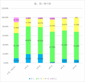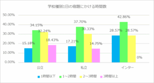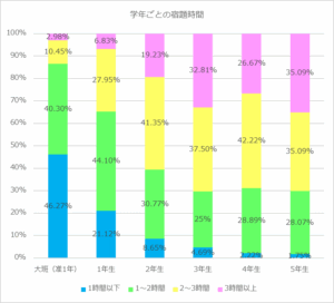 3年生以上を見ると、2時間以上が約70%、うち3時間以上が約32%となっており、5年生になると「1時間以下」という回答は全体の2%未満と、非常に少ない数値になっています。