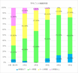 1年生でも「10時間以上」の睡眠は3割程度、4年生になると約13%が8時間未満という結果です。日本では低学年では「10~10.5時間」、高学年でも「9時間以上」が理想的とされていますが、中国でそれを実現するのはなかなか難しそうです。