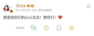 10月7日、ファン・ビンビンの「あなたたちの思いを感じています!あなたたちを思っています!」という書き込みに、多くの返信がありました。