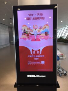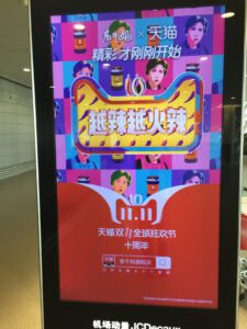 上海浦東国際空港に到着すると、出国手続きへ向かう道の電光掲示板もダブルイレブン。化粧品ブランドなど、日本でも注目される商品類以外にも、日系のお菓子メーカーや中国老舗の調味料メーカーなど、ここぞとばかりに「ダブルイレブンキャンペーン」を展開。消費者のへの訴求を強めています。