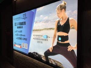 上海市内「中山公園」駅の地下道は、まさに初参戦となる健康器具メーカー「SLENDERTONE」の広告でPRジャック状態。同社は上海市内の大型商圏のひとつである中山公園駅をターゲットに定めています。