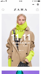 欧米系ファストファッションの老舗・ZARAではWeChatミニプログラムを利用し、モーメンツ上に広告を展開することで、独自のダブルイレブンセールを訴求しています。