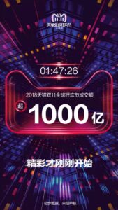 開始から1時間47分26秒:オーダー金額1000億元(約1兆6300億円)を突破(日本時間11月11日2:55追記)→2017年ダブルイレブン開始9時間後の金額