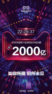 開始から22時間28分37秒:オーダー金額2000億元(約3兆3000億円)を突破(日本時間11月11日23:40追記)
