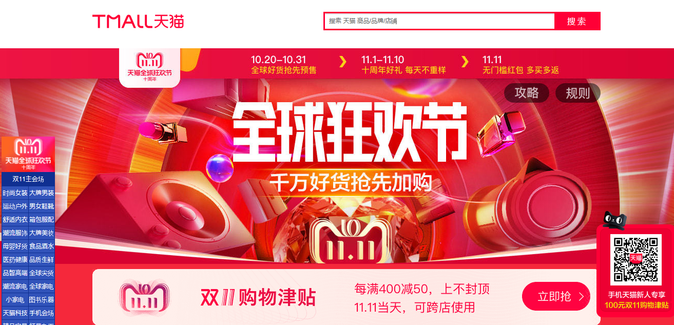 ダブルイレブンは11月11日AM0:00に正式にスタート。開始から21秒で10億元(約340億円)、2分05秒で100億元(約1640億円)のオーダーを獲得しました。