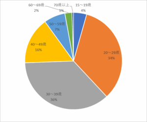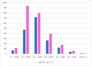 これを男女比で見てみると、女性は20代が圧倒的多数となっており、流行や美に敏感な世代が多く訪れていることがわかります。