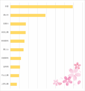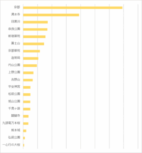 1位は「京都」、2位の「清水寺」、7位「京都御苑」、9位の「円山公園」などと合わせて、京都勢が10位内で4つもエントリーしています。普段の訪日観光でも上位の常連キーワードですが、やはり京都の古い町並みに桜が加わることで、「日本にいる感」がより一層高まることを期待しているようです。