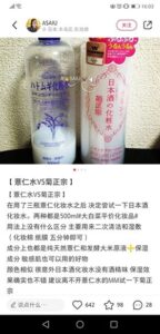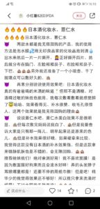 しかし、この投稿で注目したいのが「成分が似ている」とも書かれている点です。つまり「天然ハトムギ」と「日本酒(発酵させたお米)」は似ていると認識されているようで、消費者の興味も「じゃあどっちがいいの?」という点に絞られるらしく、小紅書(RED)上にはこの両者の比較体験レポートが数多く挙げられているのです。