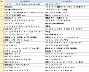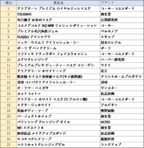 これを見ると、やはりフェイスマスク類、そしてクレンジング類が比較的強いが、2位にヘアケア商品である「TSUBAKI」(資生堂)がランクインしていることが目を引く。