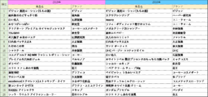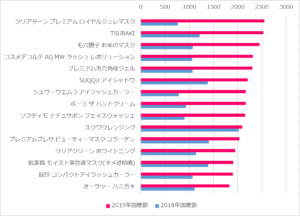 これを見ると、上位陣はいずれも昨年に比べクチコミ件数が大きく増加していることが見て取れる。トップの「クリアターン プレミアム ロイヤルジュレマスク」に関しては3倍以上の伸びを示しており、その他の商品も倍以上の伸びを見せている商品がほとんどである。