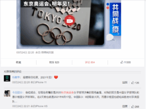 またWeiboで各メディアの同内容の記事にもポジティブな書き込みが並んでおり、単純な東京オリンピックファンだけでなく、新型コロナウイルスの状況に関心を向けている多くの中国消費者がこの決定を理解し、支持していることが見て取れる。