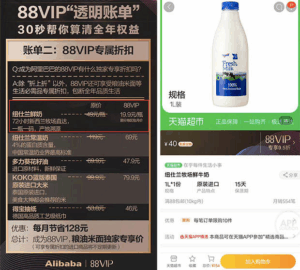 - 「淘气值」という会員の評価システムで点数が1000点以上かつ88元を払えば88VIP会員になることができる。