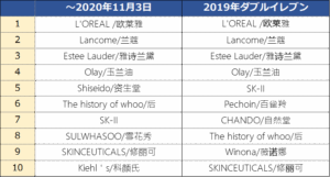【表】2020年11月3日末時点でのスキンケアブランドランキング