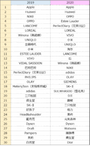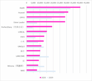 これを見るとトップ2ブランドは変わらずだが、2019年とは異なりメイクアップブランド「Perfect Diary(完美日記)」そしてスキンケア部門1位のEstee Lauderが上位に食い込みを見せている。