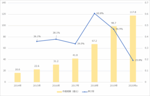 市場規模としては2020年の予想値で117.8億元と6000億元近い全体市場の中においては非常に小さい。