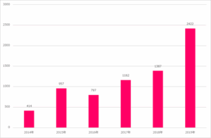 また同レポートの2014年からの「美白スキンケア化粧品登記数」の推移を掲載しているが、それを見ても、2019年の時点では前年の75%の伸びを見せており、美白商品の増加も顕著となっている。