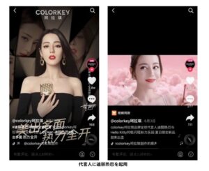 同ブランドが起用しているのが「世界で最も美しい顔100名」の上位にランクインしたことのある、迪麗熱巴(ディリロバ)。中国では知らない人はいないほど有名。それを抖音で絨毯爆撃式に大量投下することで、ファンでなくとも「colorkeyというブランドは迪麗熱巴を使っている」という認知を広げることにもなるのである。