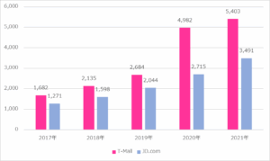 天猫は2020年、2期制度を導入したことで一気に取引総額を伸ばしたが、その分2021年は成長を鈍化させている。