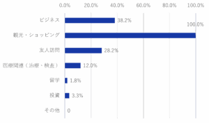 訪日目的としては観光目的のほか、ビジネス目的また日本在住の友人訪問という目的といったものが多く、かつて「メディカルツーリズム」として注目された日本での治療・健康診断を目的とした訪日も12%程度存在していた。
