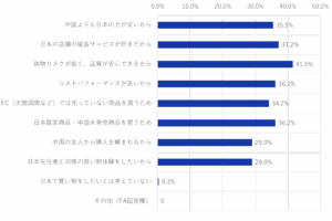 最も多い理由は「偽物がない・品質が安心」で、日本商品、買い物環境への安心感であった。