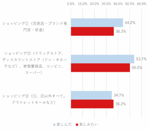 アンケートでは「コロナ以前に日本で何を楽しんだのか」と「解禁後、日本で何を楽しみたいのか」について聞いているが、その結果のなかからショッピングに関わる部分だけを抜き出した。