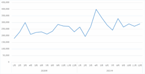 またそれを月次で見てみると、一定の起伏はあるが2020年年初から2021年にかけて徐々に伸びて行っているのが見て取れる。