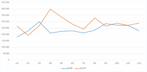 期間は2020年1月~12月、そして2021年1月から12月を比較させてみることとした。