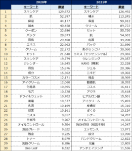 こうした「保湿」、「補水」悩みに対するためか、「クリーム」や「乳液」といったキーワードも2020年に比べて順位を上げ、クチコミ件数も大きく増加している。