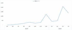 まずクチコミ件数だが、2021年5月から11月までの月のクチコミ件数は多くても300件程度だが、12月に一気に1200件を超え、いったん400件程度に落ち着いたが、2022年3月に2000件再び急上昇。