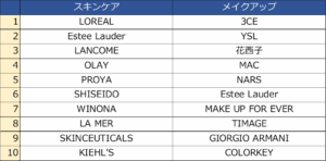 スキンケアブランドは「LOREAL」、「Estee Lauder」、「LANCOME」といった大手欧米系ブランドが盤石の状態。日本勢からは資生堂も安定のトップ10入りを果たしている。