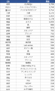 また同ブランドが「アジア太平洋エリアの代言人」として起用しているのは、Z世代にも人気の高いトップアイドル「王源」であり、こうしたCLINIQU関連キーワードが、「精簡スキンケア」の頻出ワード上位を占めた。