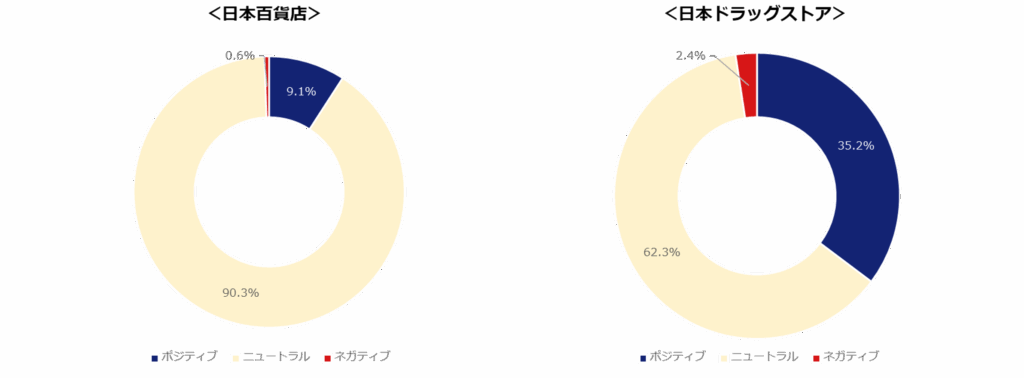 「日本百貨店」の投稿に関して、ネガティブ率は0.6%と極めて低いが、ポジティブ率も9.1%と決して高くない。大部分がニュートラルの投稿である。