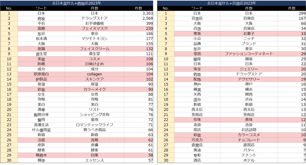 まず株式会社NOVARCAが2024年1月に発効した『中国SNSクチコミから見る2023年インバウンド概況レポート』でも同様にドラッグストア人気が出ていたが、明らかに中国消費者が「購入するモノを分けている」傾向が見えた。