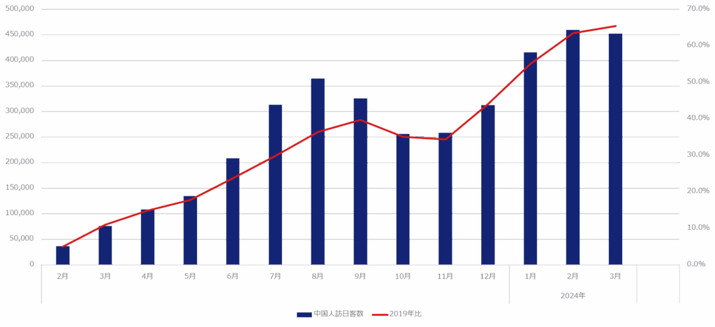 【グラフ】2023年1月から2024年3月までの中国(メインランド)訪日観光客数推移