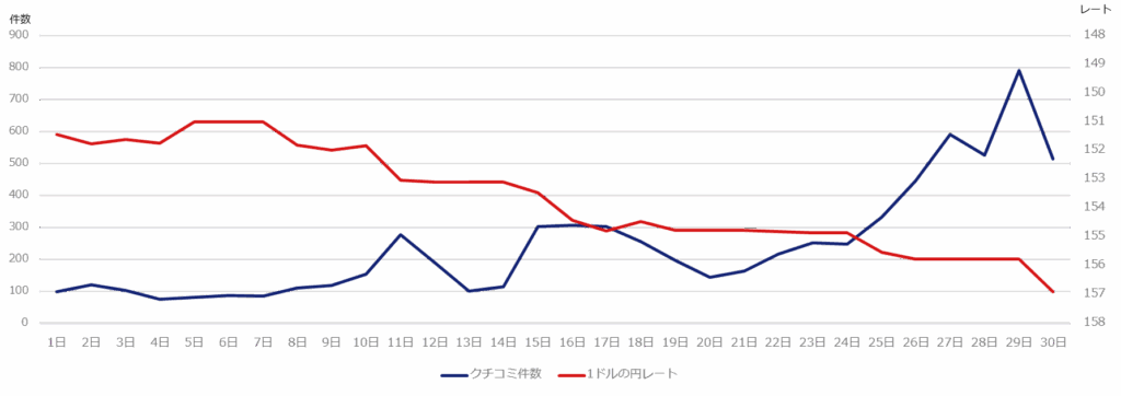 そして、4月末に1ドル160円に近付き、まさに最安値をつけようとしている際に、小紅書上のクチコミもMAXに達している。