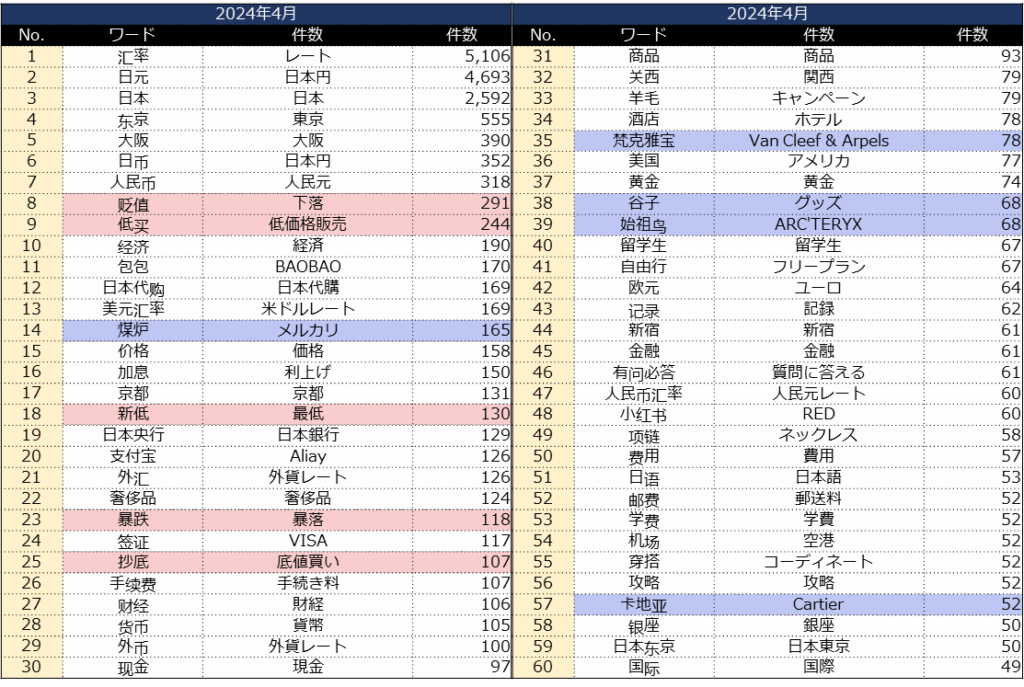 【表】2024年4月小紅書「日本円×レート」投稿のキーワード上位60