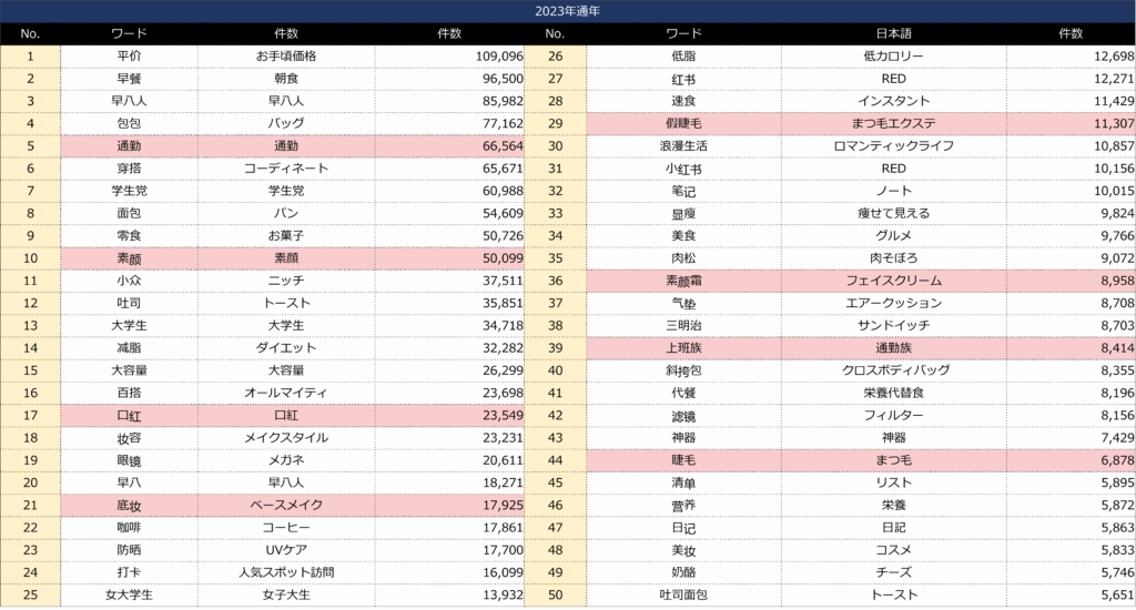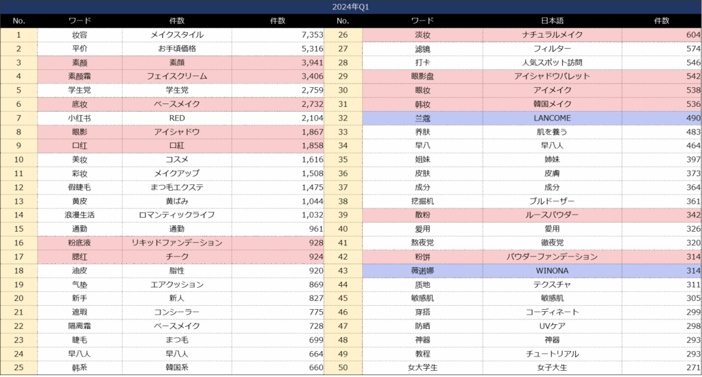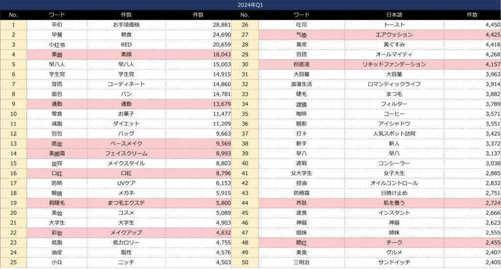 そして「素顔」というワードが2023年通年、2024年Q1でも上位に見え、素顔メイクを牽引しているのが見える。