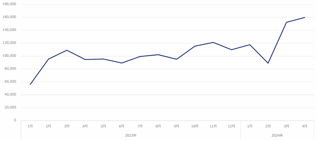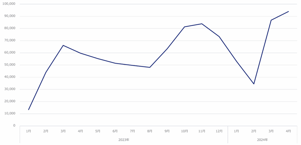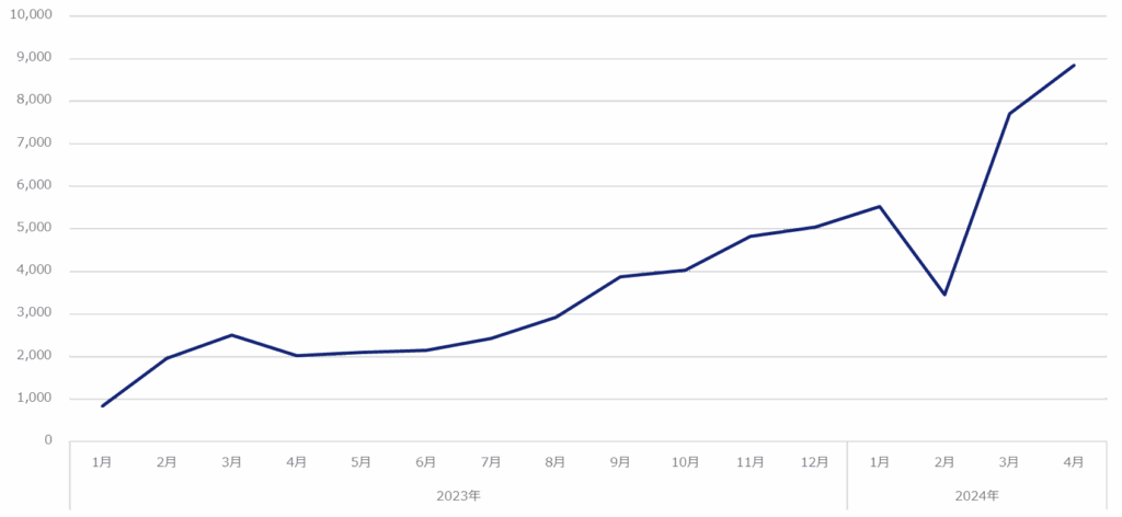 なぜなら下のグラフをみると、「早八人×メイクスタイル」というキーワードでの小紅書投稿は増加を続けており、2023年4月に2,000件程度だったものが、1年後の2024年4月には8,800件と、4倍以上に達しているからである。