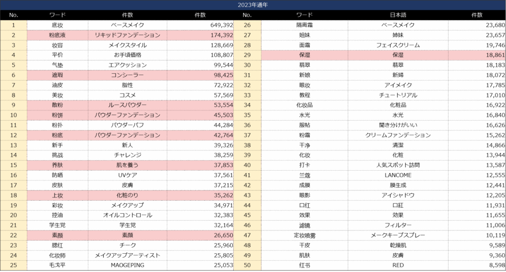 【表】小紅書における2023年「底粧(ベースメイク)」のクチコミキーワード