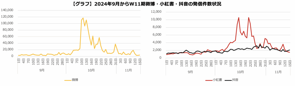 これを見ると「W11(双十一)」キーワードでの投稿件数は減少傾向にあるが、特に微博の発信比率は減少している。増加傾向にあるのは抖音で商戦期のSNSの力の変化を見ることができる。