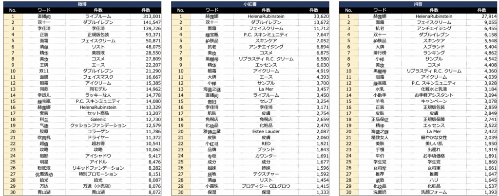 HelenaRubinsteinのSNS各プラットホームのクチコミワードを見た。期間は9月1日~11月15日までとした。